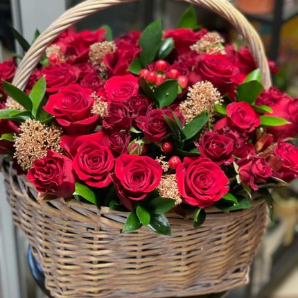 Корзина Ренессанс из эустомы, трахелиума, альстромерии, роз, антирриума и агапантуса