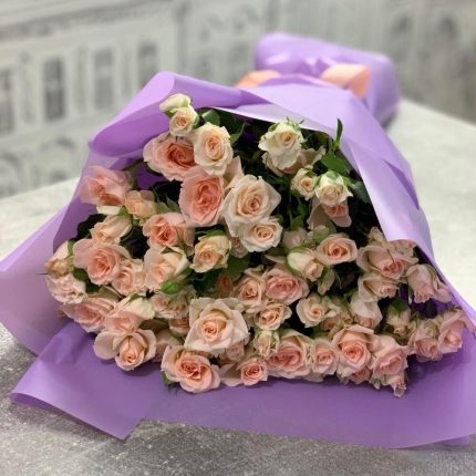 Корзина Прекрасная Иллюзия из роз сорта капучино, фридом, эустомы и кустовых роз
