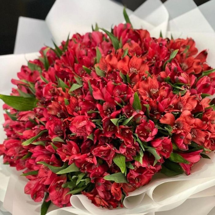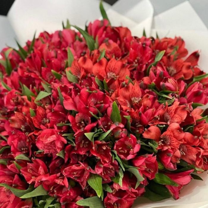 Альстромерия красная – 25 шт.Упаковка дизайнерская – 2 шт.Лента атласная – 2 шт.Открытка – 1 шт.инструкция по ухода за цветами – 1 шт.хорошее настроение – 100 шт.коробка переноска – 1 шт.Кризал – 1 шт.