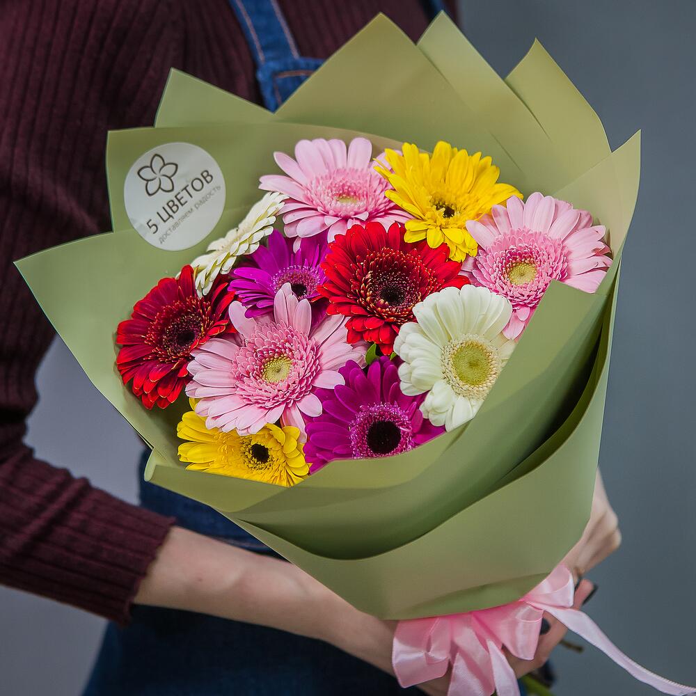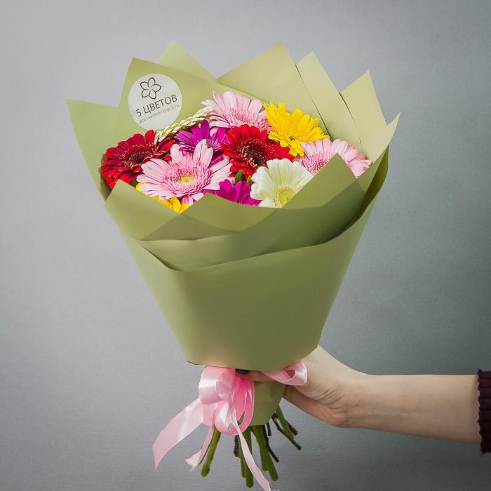 Гербера розовая – 3 шт.Гербера желтая – 3 шт.Гербера белая – 3 шт.Гербера красная – 2 шт.Фисташка – 1 шт.