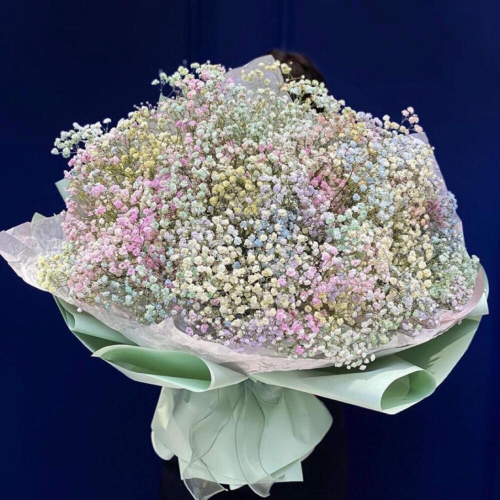 гипсофила радужная – 35 шт.Упаковка дизайнерская – 2 шт.Лента атласная – 2 шт.Открыточка с вашими пожеланиями – 1 шт.хорошее настроение – 100 шт.инструкция по уходу за цветами – 1 шт.коробка переноска – 1 шт.Кризал – 1 шт.