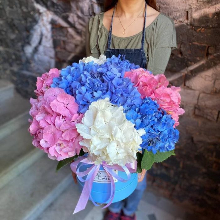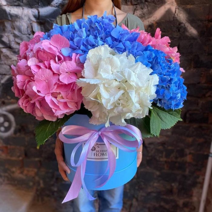 Букет из 9 гортензий в шляпной коробке