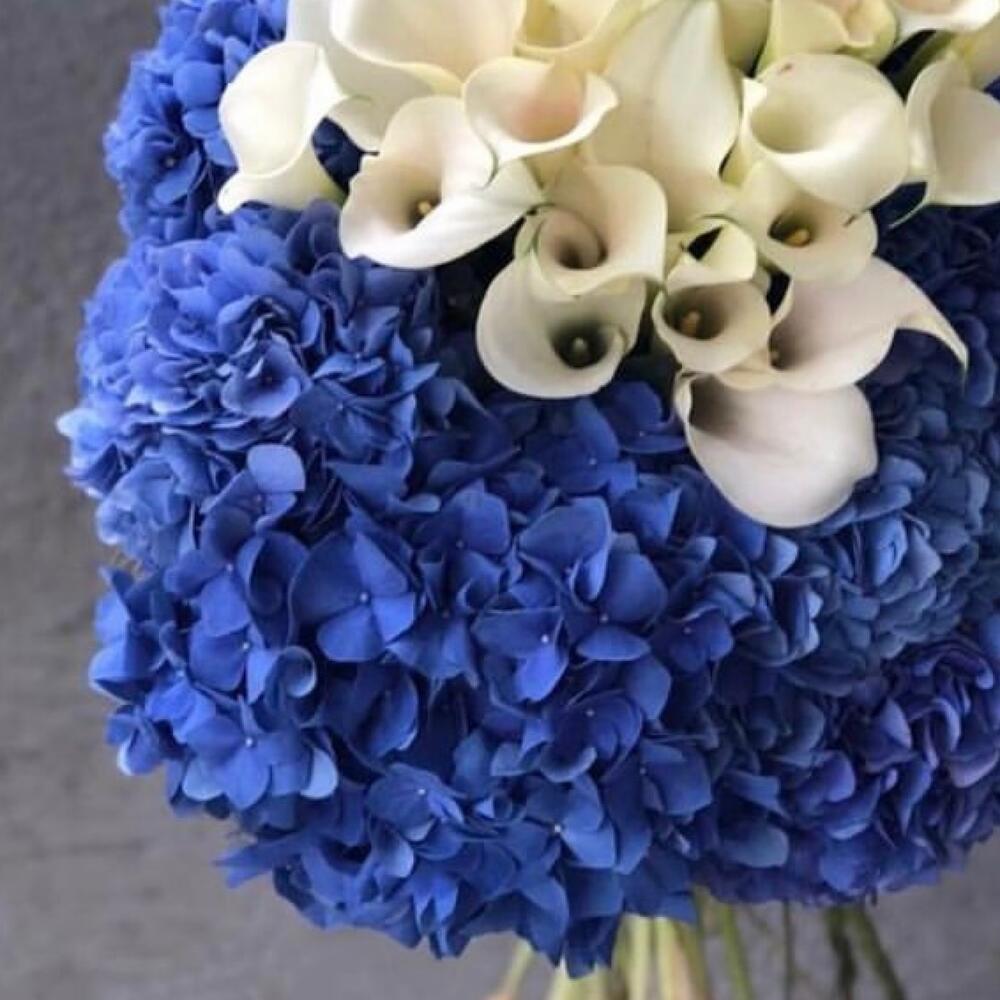 Гортензия синяя – 13 шт.Калла белая – 26 шт.Лента атласная – 1 шт.Открытка – 1 шт.хорошее настроение – 100 шт.инструкция по уходу за цветами – 1 шт.коробка переноска – 1 шт.Кризал – 1 шт.