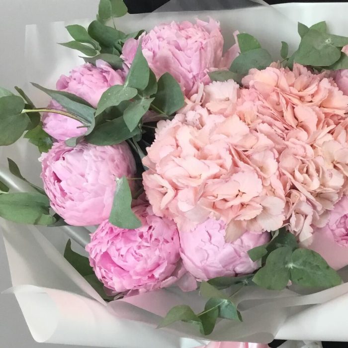 Гортензия – 1 шт.Эвкалипт – 4 шт.Лента атласная – 1 шт.Пленка матовая – 2 шт.Пион Голландия – 8 шт.