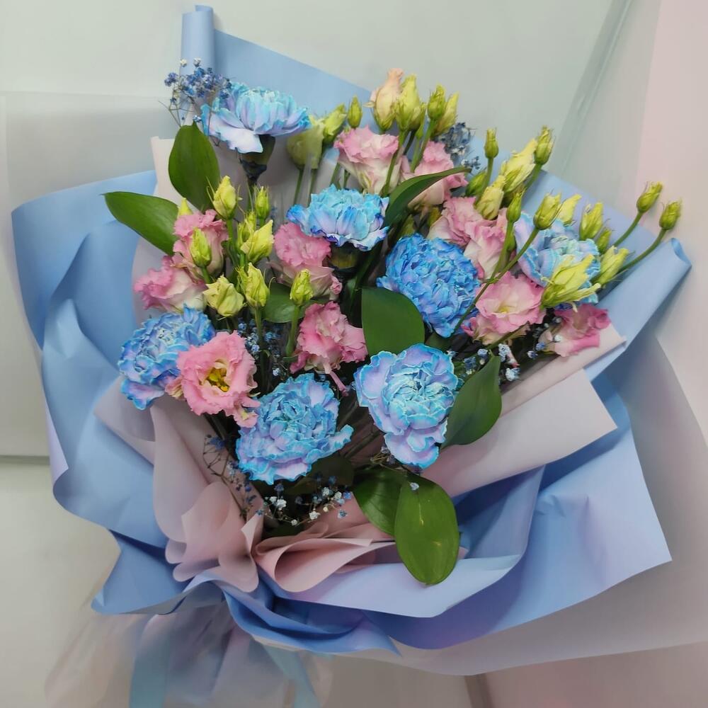 Лизиантус махровый розовый – 4 шт.диантусы голубые – 7 шт.гиасофила – 1 шт.Рускус – 3 шт.Дизайнерская упаковка – 1 шт.