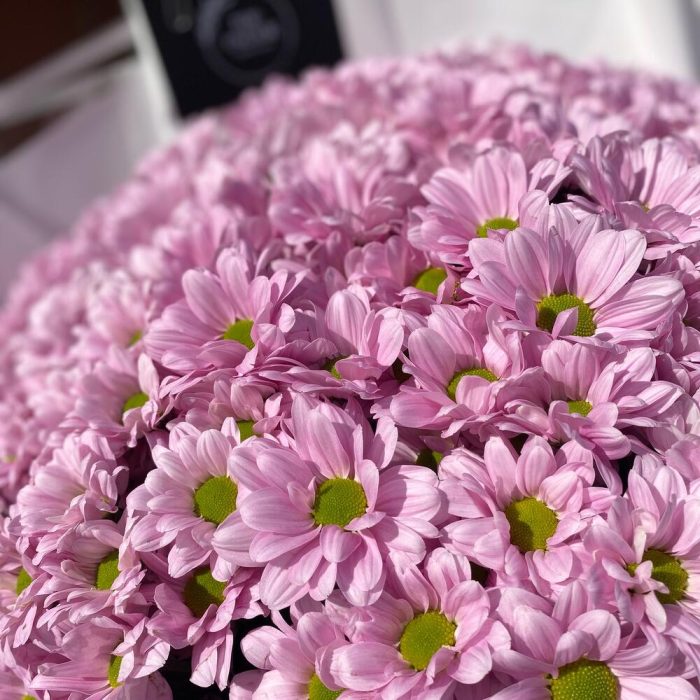 Атласная лента – 1 шт. Ромашковая хризантема – 41 шт. Дизайнерская упаковка – 1 шт.