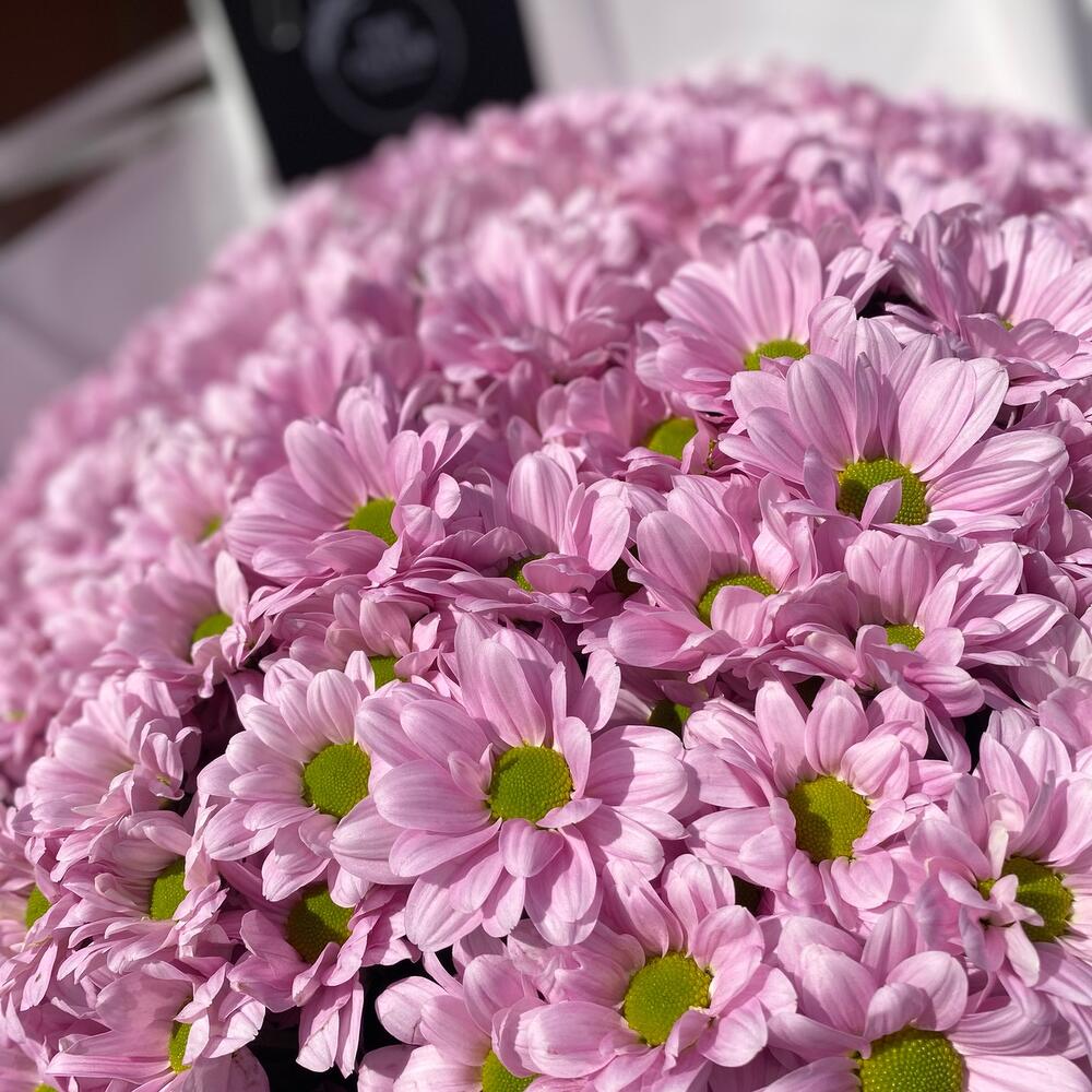 Букет из 41 ветки ромашковых хризантем в дизайнерском оформлении. Количество ромашек в букете может достигать 401 штуки