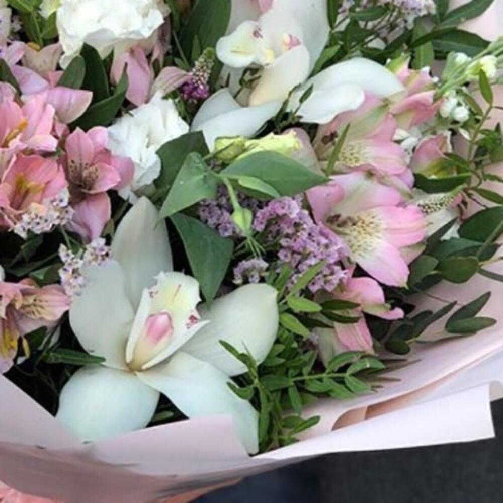 Орхидея Цимбидиум – 5 шт.Лизиантус – 3 шт.Альстромерия – 6 шт.Фисташка – 6 шт.Эвкалипт – 3 шт.Сантини – 3 шт.Упаковка дизайнерская – 3 шт.Лента атласная – 2 шт.