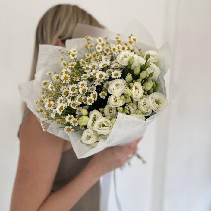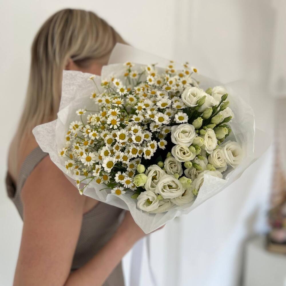 Ароматный букет из ромашек, сантини и стойкой эустомы