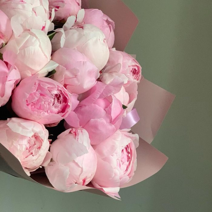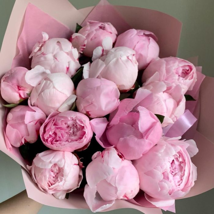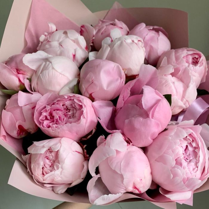 Лента – 3 шт.Тишью – 2 шт.Упаковка дизайнерская – 4 шт.пион розовый сара бернар – 15 шт.