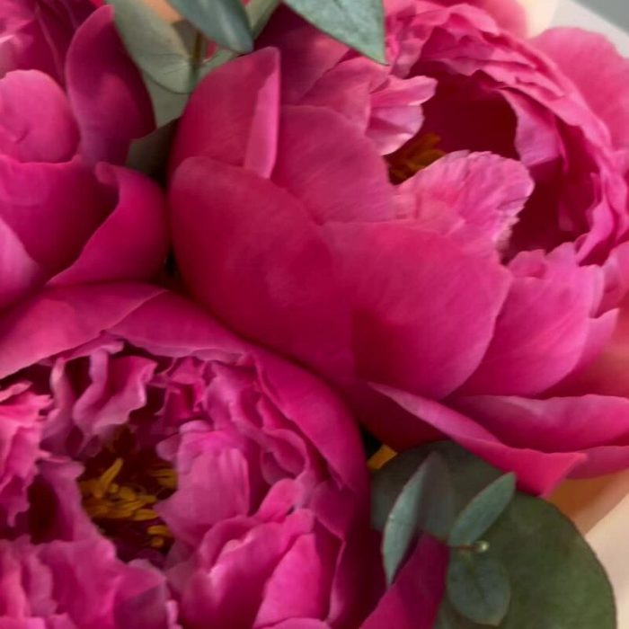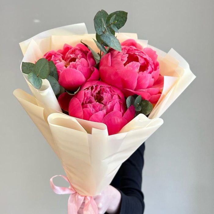 Пион – 3 шт.Эвкалипт – 1 шт.Лента атласная – 1 шт.Упаковка дизайнерская – 2 шт.