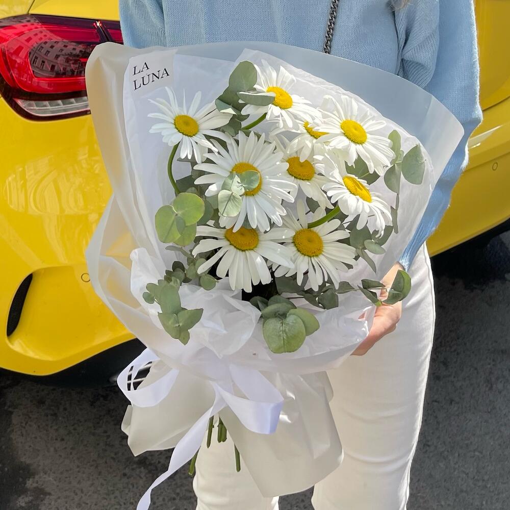 Ромашка – 9 шт.Лента атласная – 1 шт.Упаковка дизайнерская – 1 шт.Кризал (подкормка) – 1 шт.Аквапак – 1 шт.инструкция по уходу за цветами – 1 шт.транспортировочная упаковка – 1 шт.эвкалипт cineria пучок – 2 шт.