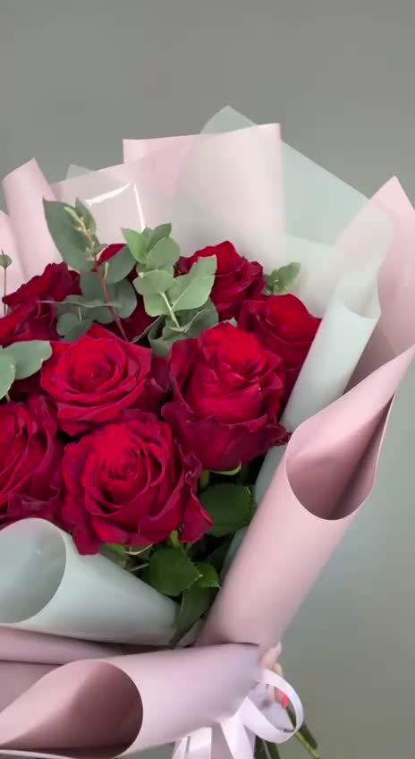 Эвкалипт – 3 шт.Лента атласная – 1 шт.Роза Эксплорер – 11 шт.Упаковка дизайнерская – 2 шт.