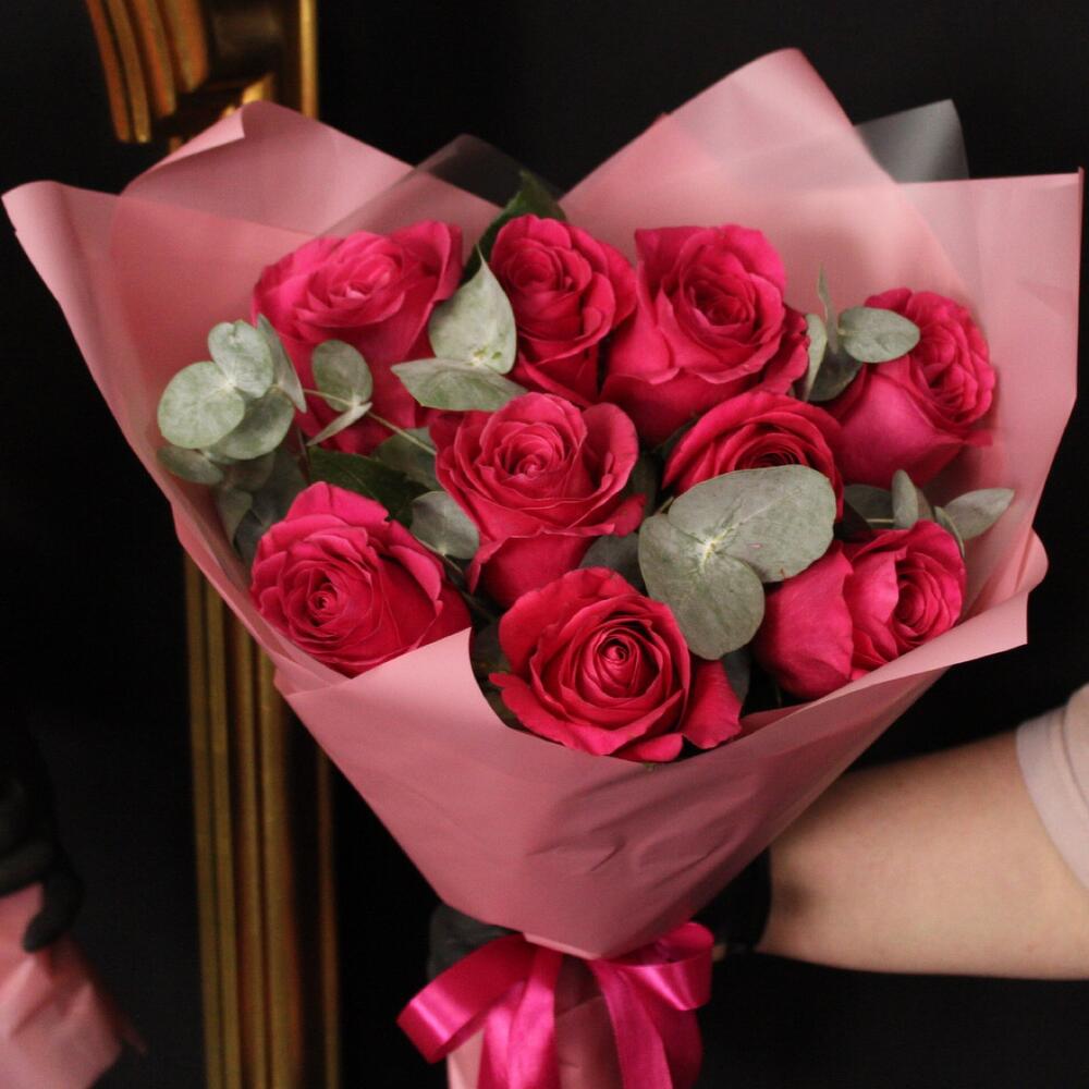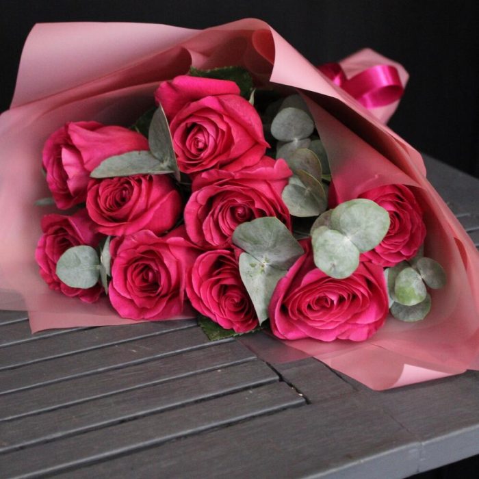 Роза эквадор Pink Floyd – 9 шт.Эвкалипт – 3 шт.Пленка матовая – 4 шт.Лента атласная – 2 шт.