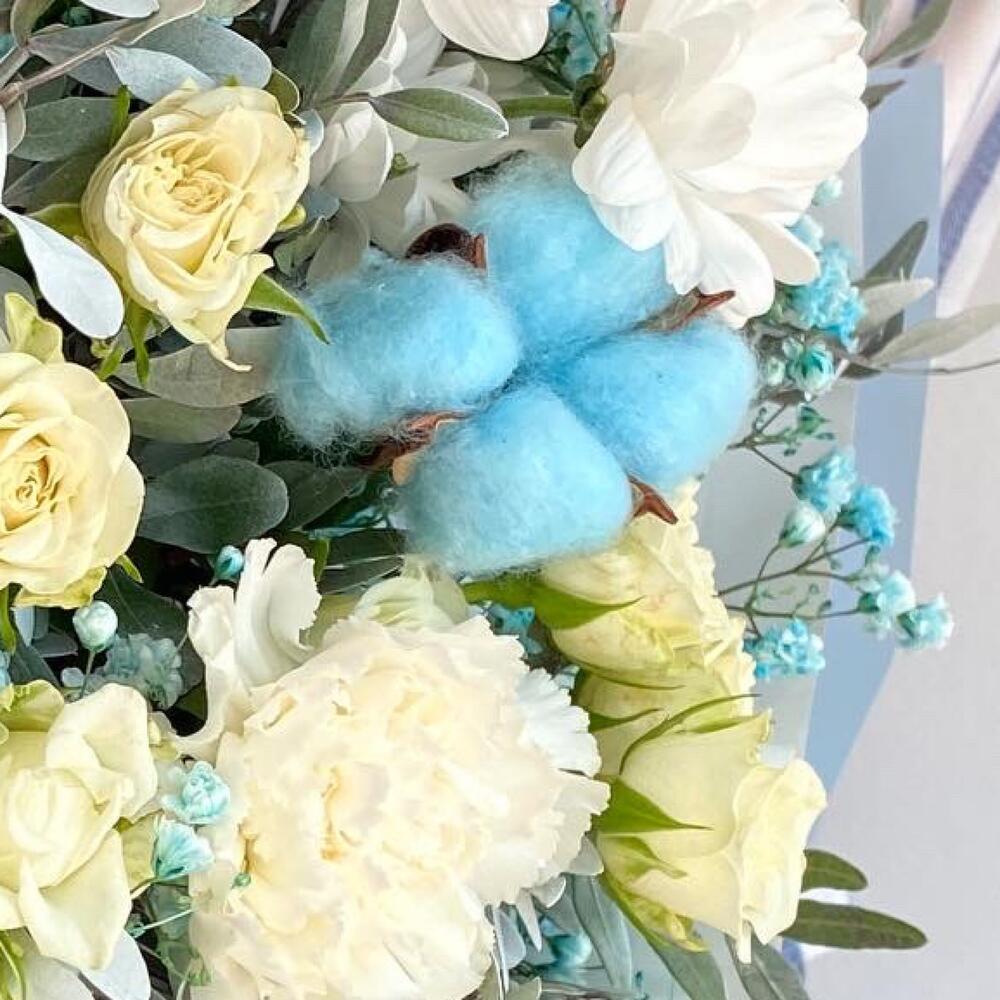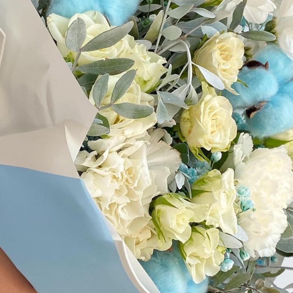 Авторский голубой букет с хлопком и кустовыми розами