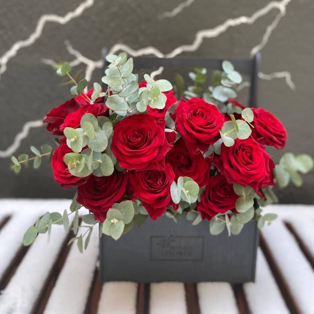 Роза – 19 шт.Эвкалипт – 4 шт.Оазис – 1 шт.Ящик – 1 шт.