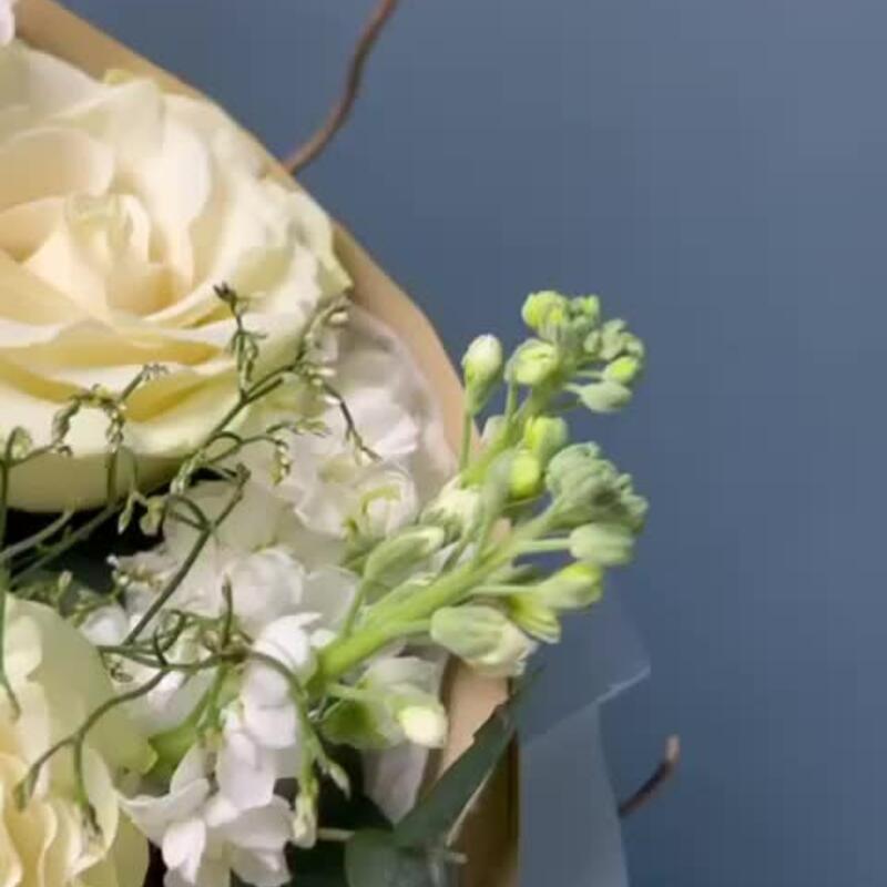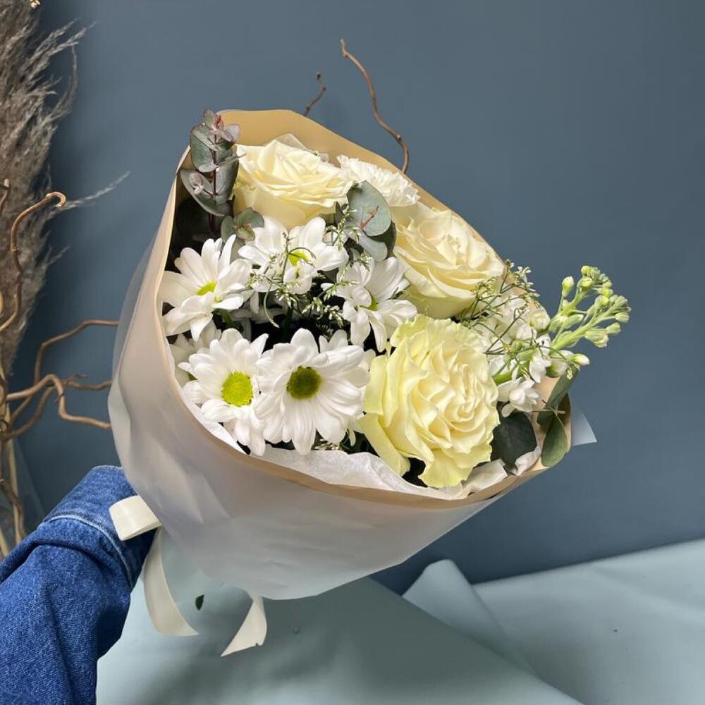 Лимониум – 1 шт.Маттиола – 2 шт.Хризантема кустовая – 1 шт.Эвкалипт – 3 шт.Роза одноголовая – 3 шт.Гвоздика – 2 шт.Упаковка дизайнерская – 2 шт.