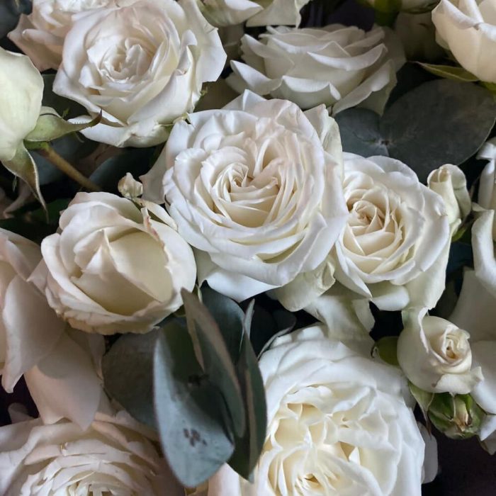 Кустовая роза – 7 шт.Эвкалипт – 3 шт.декоративная упаковка – 1 шт.Атласная лента – 1 шт.