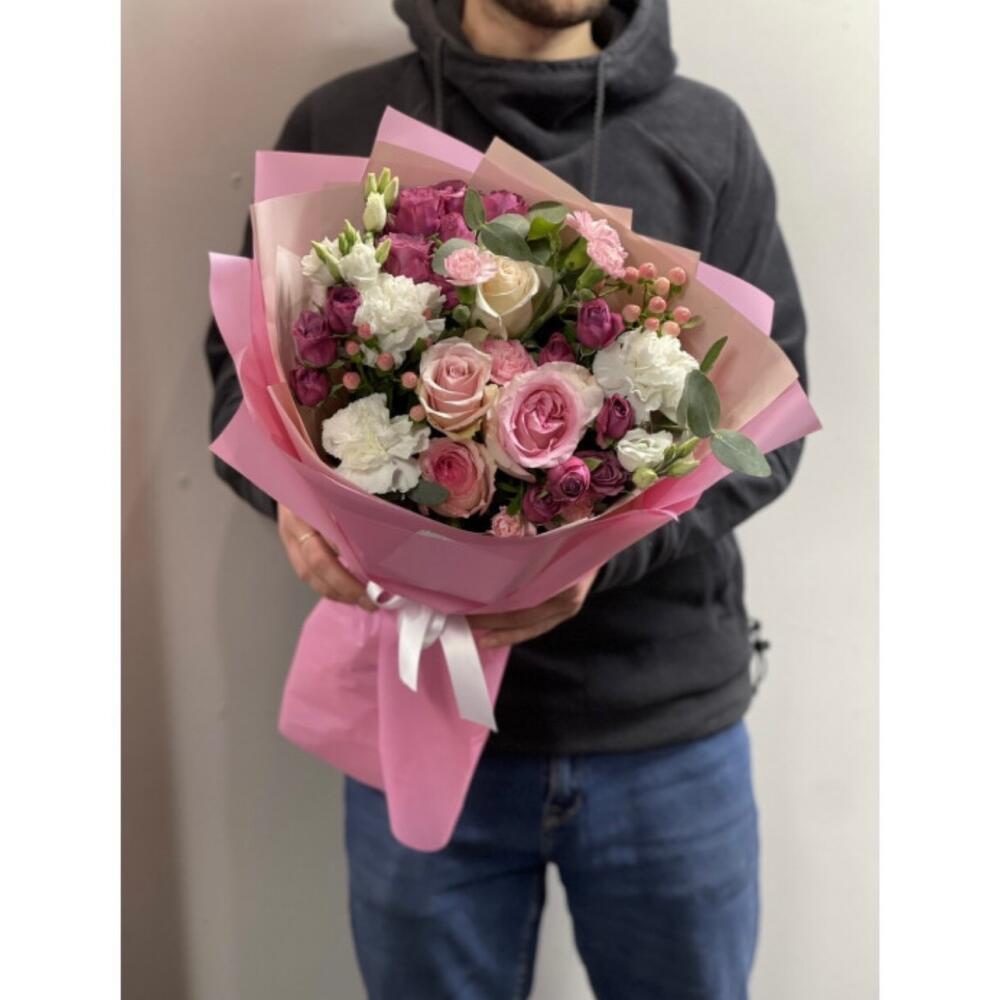 Альстромерии, Гвоздики, Кустовые розы, Лизиантусы, Розы, Хризантемы