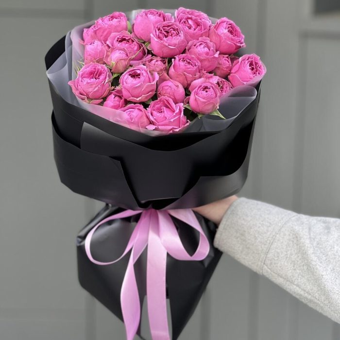 Букет Розовые сладость из 7 веток кустовой пионовидной розы в черном оформлении