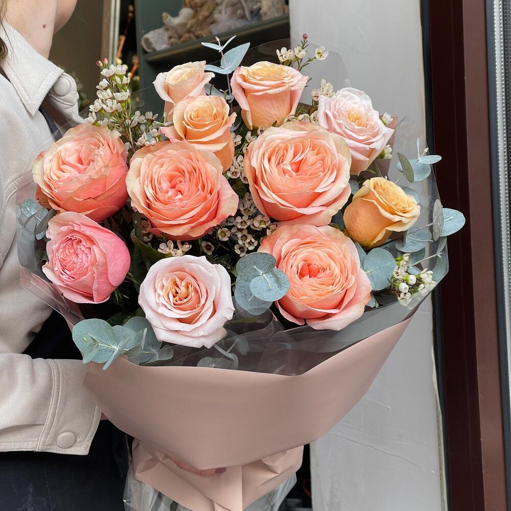 Ваксфлауэр – 2 шт.Лента – 1 шт.Эвкалипт – 2 шт.Роза одноголовая – 11 шт.Упаковка дизайнерская – 1 шт.