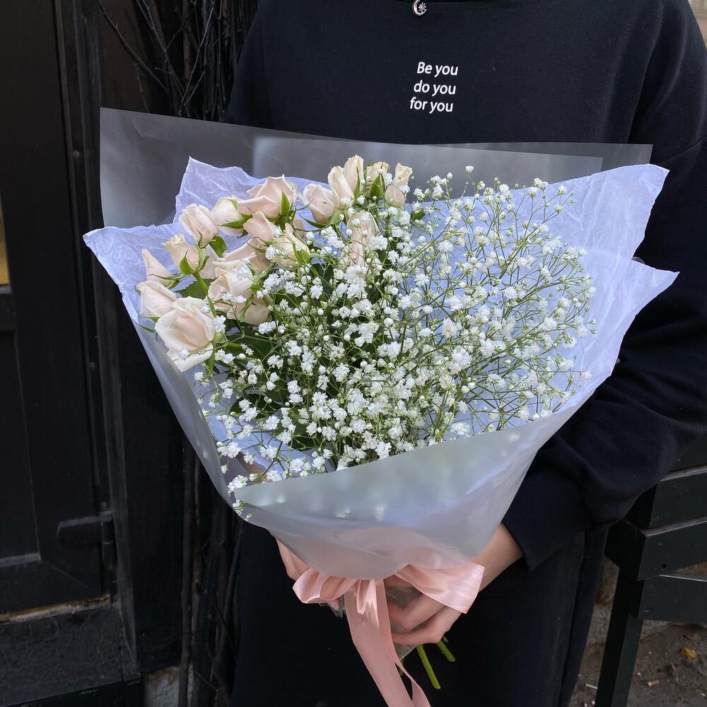 Роза кустовая – 5 шт.гипсофила белая – 6 шт.Тишью – 1 шт.Упаковка дизайнерская – 2 шт.Лента атласная – 1 шт.