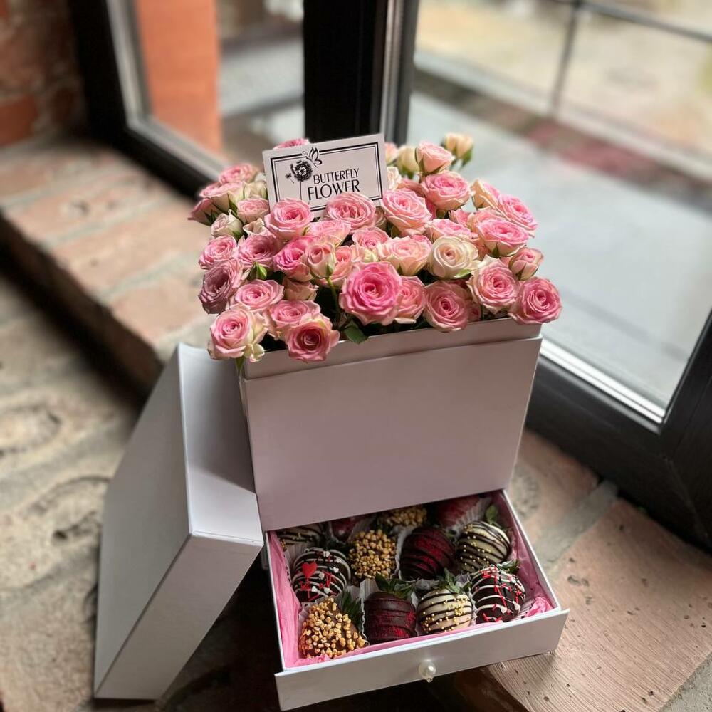 Композиция из кустовых роз и сладкой клубники в бельгийском шоколаде “Кустовые розы и клубника”