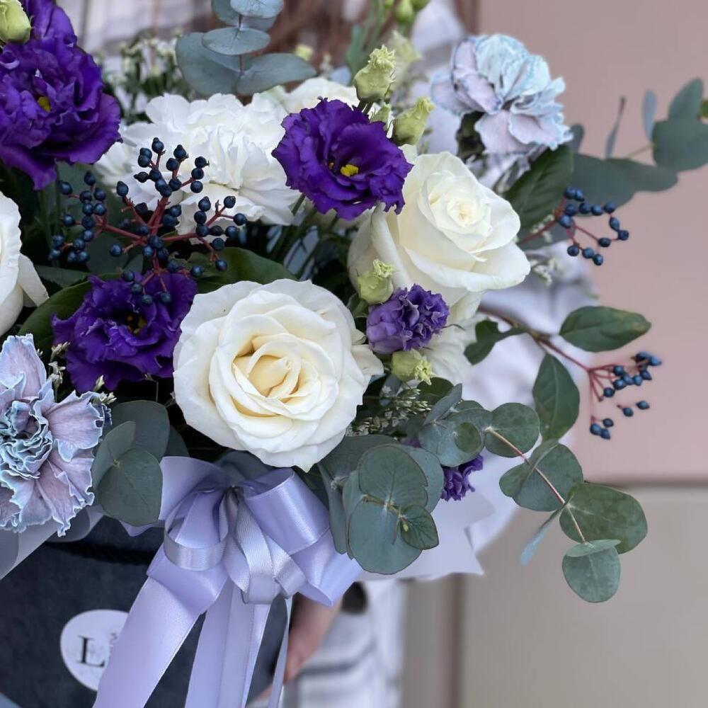 Вибурнум – 3 шт.Эвкалипт – 3 шт.Роза Эквадор – 6 шт.Эустома – 2 шт.Гвоздика белая – 3 шт.Шляпная коробка – 1 шт.Оазис флористический – 1 шт.гвоздика крашенная – 5 шт.