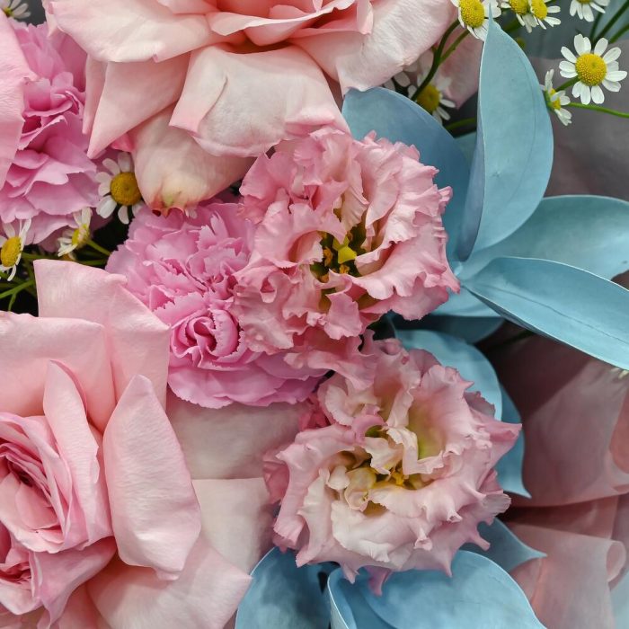Категории: Гвоздики, Лизиантусы, Розы, Ромашки