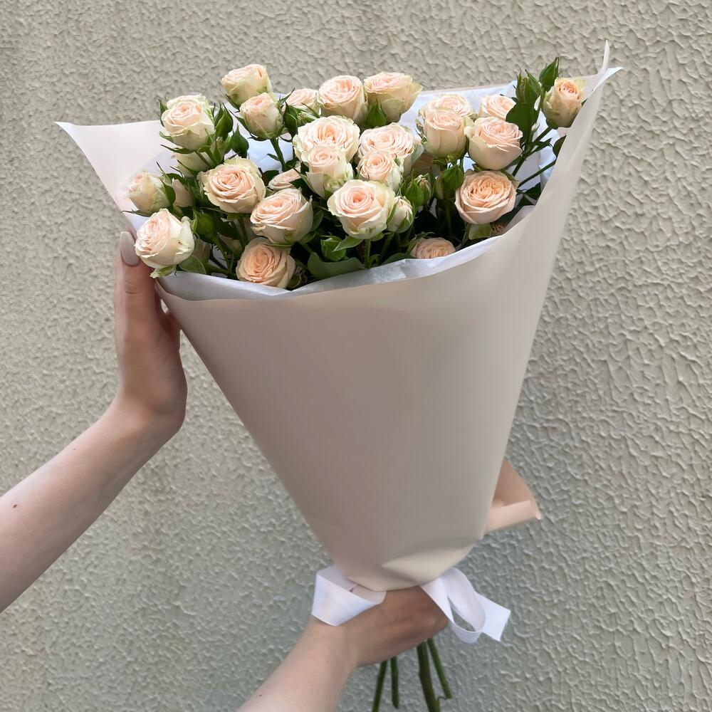Лента атласная – 2 шт.Упаковка дизайнерская – 2 шт.Упаковка тишью – 1 шт.подкормка для срезанных цветов – 1 шт.кустовые пионовидные розы – 5 шт.