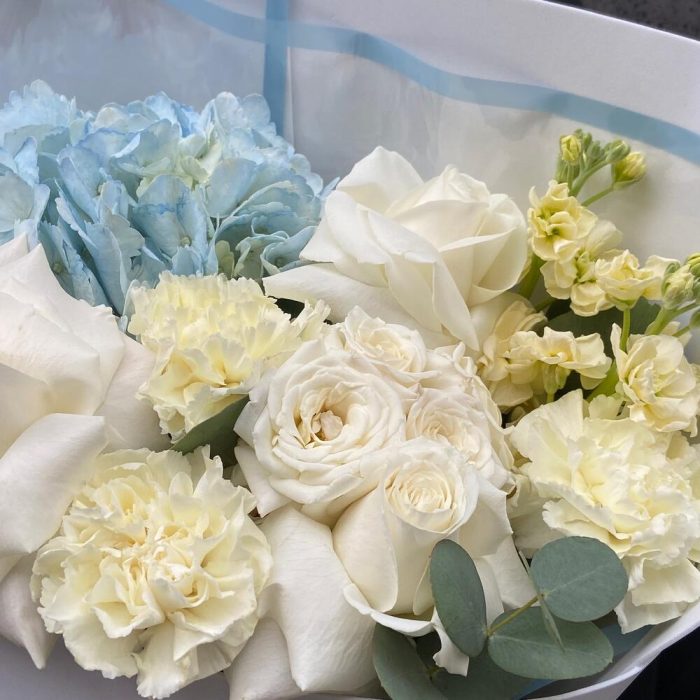 Гортензия – 1 шт.плая бланка – 3 шт.Маттиола – 2 шт.Кустовая роза – 1 шт.Диантус – 3 шт.Эвкалипт – 3 шт.Фоамиран (упаковка) – 2 шт.Подложка – 1 шт.Лента атласная – 2 шт.