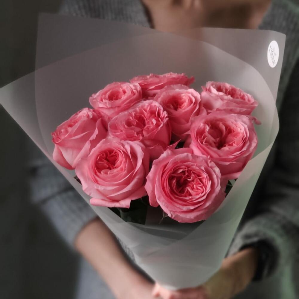 9 шикарных роз сорта Pink Expression (Пинк Экспрешн) в моно-букетеСорт с насыщенным оттенком бутона и пионовидным раскрытиемБукет оформлен упаковкой и атласными лентами