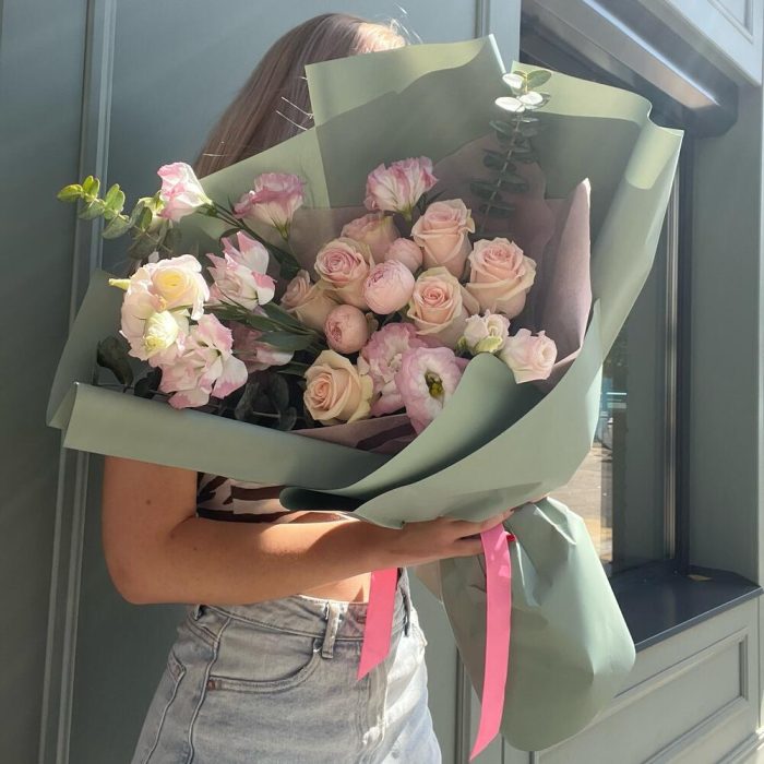 Альстромерии, Гвоздики, Кустовые розы, Лизиантусы, Розы, Хризантемы