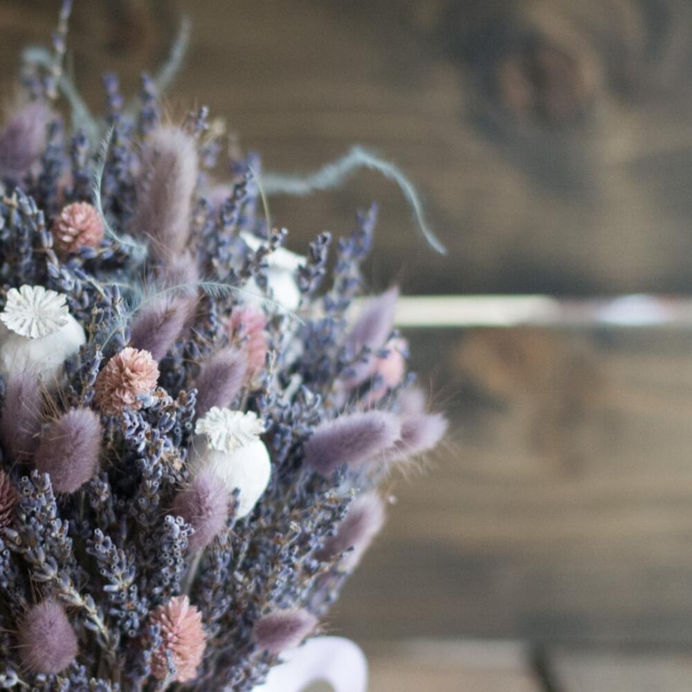 Лаванда (сухоцвет) – 159 шт.Лагурус (сухоцвет) – 30 шт.Шляпная коробка с лентой – 1 шт.Оазис флористический – 1 шт.